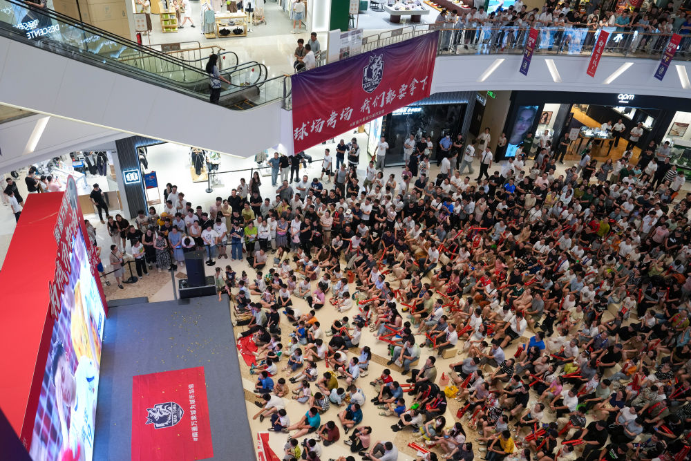 6月29日,市民、球迷在南通市内一处商场观看“苏超”比赛直播。新华社记者 李博 摄