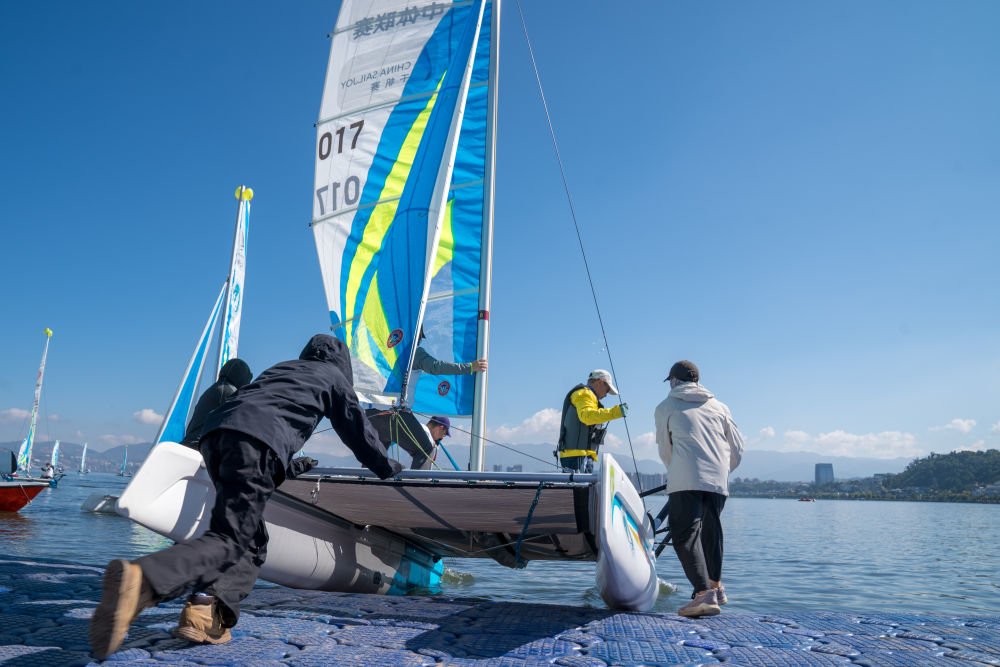 2024年10月26日,参加中国万水千帆赛(大理站)比赛的船只从出发点下水。当日,2024中国户外运动产业大会正式启幕。作为大会四大板块之一的“赛事活动”也于当日开赛。“赛事活动”板块共涵盖4场国家级赛事,分别是大理环洱海自行车赛、中国万水千帆赛(大理站)、大理徒步行以及古城人车定向挑战赛。新华社记者 彭奕凯 摄